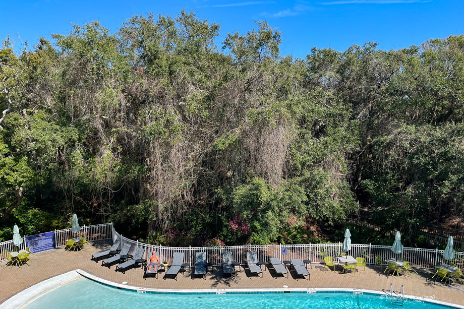 Our room had a balcony overlooking the pool and maritime forest. Beyond the trees is the Atlantic Ocean, Other guests were relaxing by the pool while we were relaxing on our balcony.