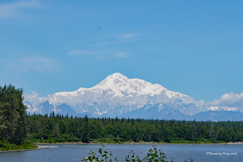 The following example was taken while on a train trip on the Alaska Railroad. The sky was clear when Mt. Mckinley (or Mt. Denali) came into view. The lake and green trees form the foreground. The mountain in the middle ground is the main subject. The blue sky is a perfect background for the image.