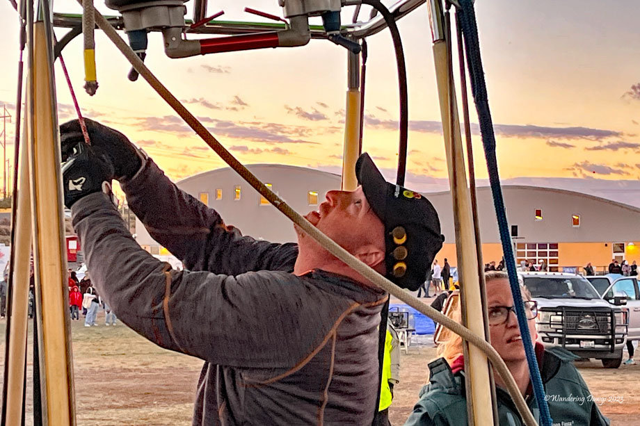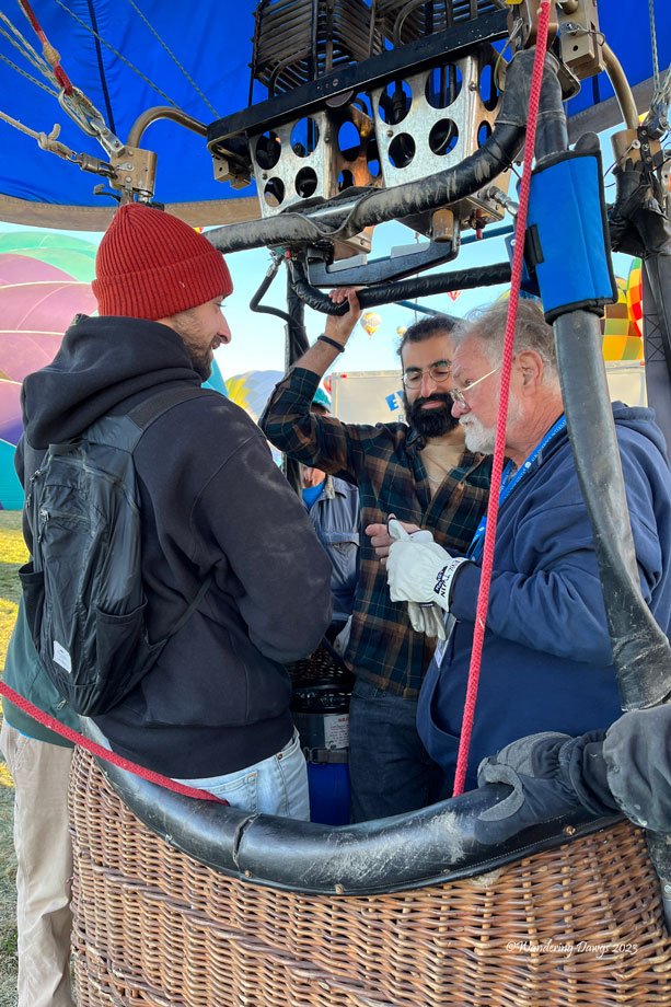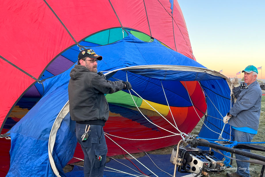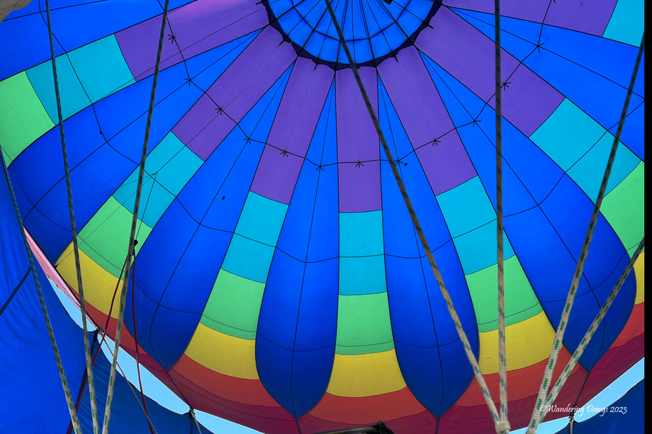 Don was piloting the balloon that day. I started out by helping take the balloon out of it’s storage bag while Don and some of the others prepared the basket to be connected to the balloon. I watched as they inflated the balloon by blowing air from a powerful fan into the balloon. I captured a couple of shots of the inside of the balloon as it was being inflated. Don had two passengers that day.