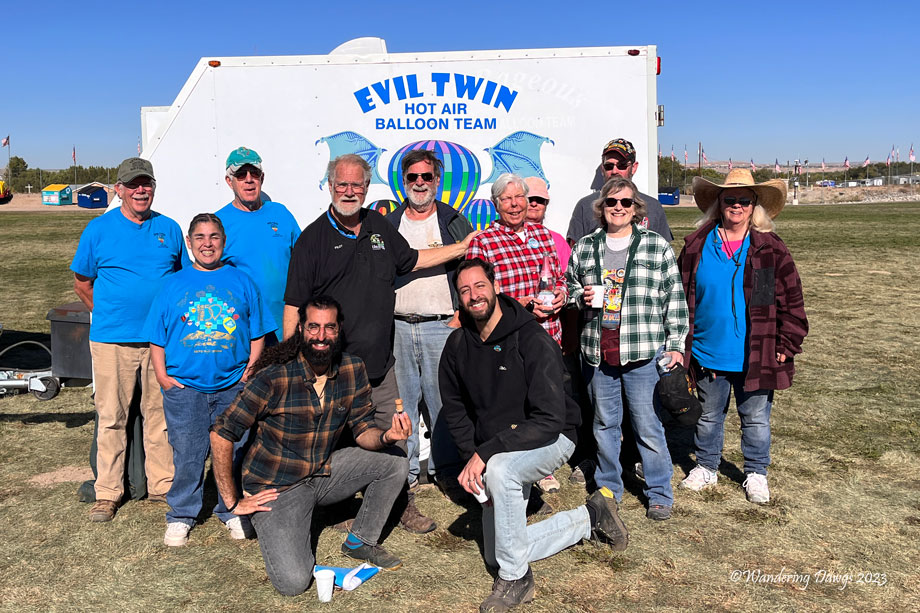 When everything was ready and the launch director gave Don the ok to launch the Evil Twin was up in the air. The chase crew piled into the van to follow the balloon to wherever it landed. Kelli was driving the van and was in radio contact with Don. We were soon at their landing site. We helped get the balloon back into it’s bag, loaded everything into the trailer and were soon back at the Fiesta Park for a celebration and a group photo.