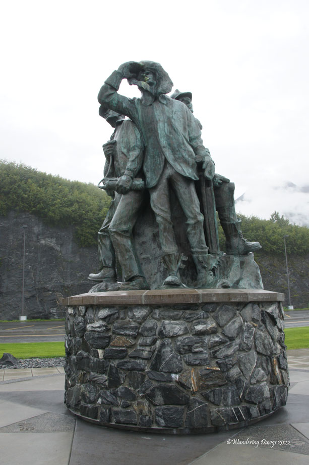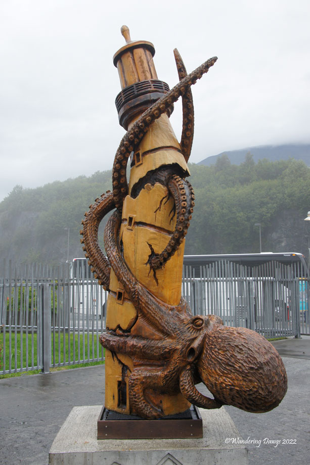 Our shuttle ride back to the cruise ship dock took us near the RV park. As we drove through town our driver pointed out points of interest. Back at the cruise ship dock we wandered around the to see a monument dedicated to the men and women who built the Trans-Alaska Pipeline from 1969 to 1977. Another interesting sculpture has a giant octopus attacking a lighthouse.