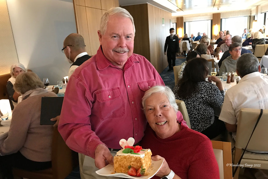 Back on board ship we returned to our stateroom to find a bottle of champagne to celebrate our 52nd anniversary courtesy of the Viking Orion crew. We took the champagne with us to dinner to enjoy with our meal. We were surprised after dinner when our server brought us a cake to add to our celebration!