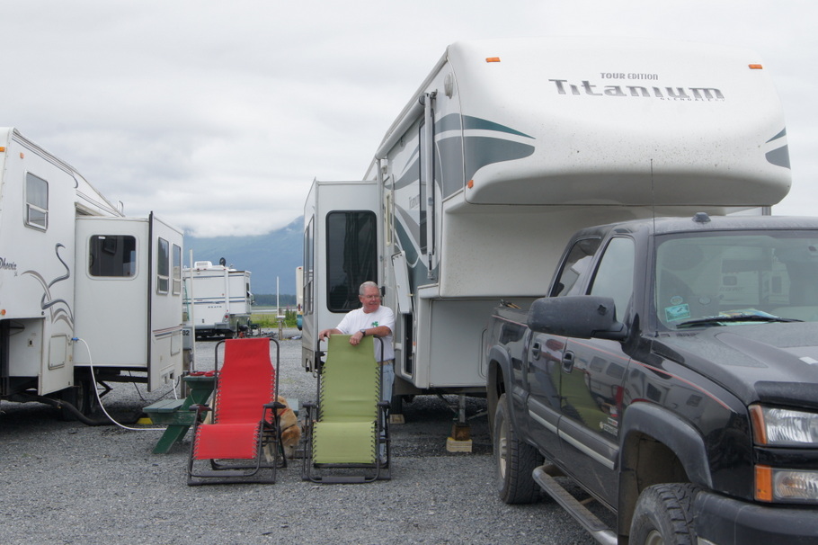 Our campsite at Bayside RV Park in Valdez. The bay is behind the camper.