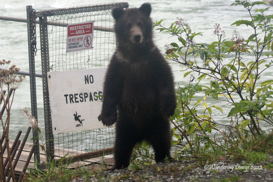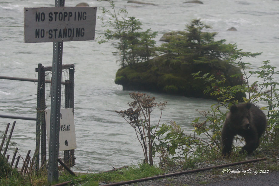 As we passed by the fish weir again on our way to our next destination Cydnie stopped the bus when she saw this bear cub right by the road. I was lucky to the be on the side of the bus where he was and captured a few images of him. When he stood up to show us how big he was it was time to leave. Mama was in the river watching the whole time.
