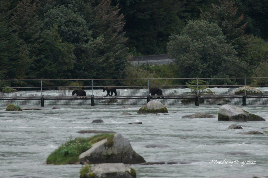 Our next stop was to see the Chilcoot River fish weir which is used to count the number of salmon swimming up the river. Someone spotted three bears on the weir!
