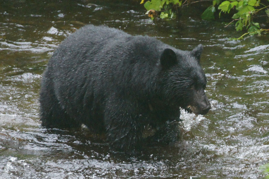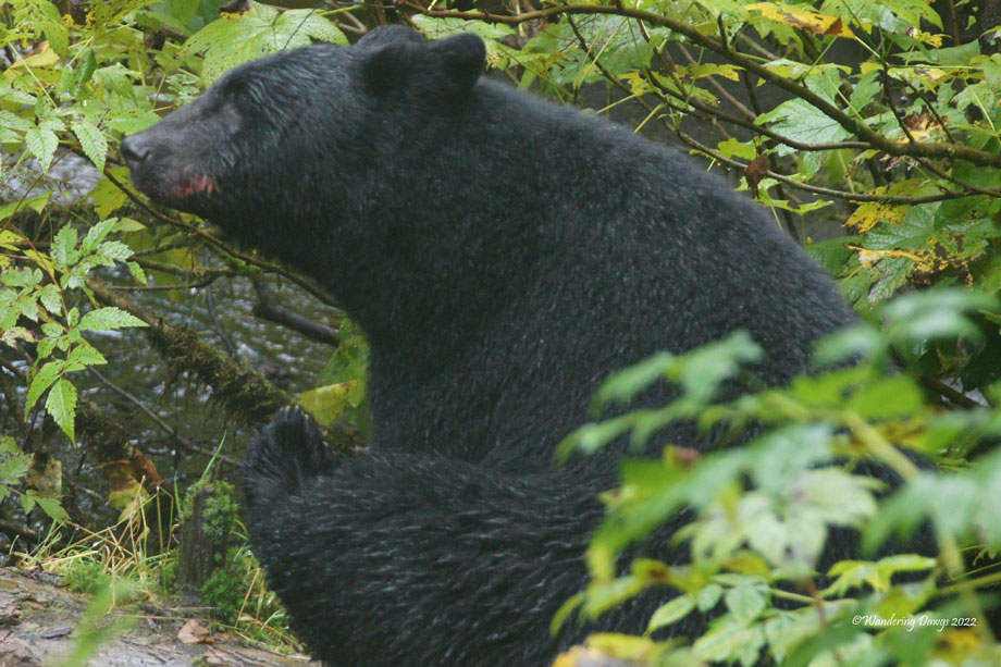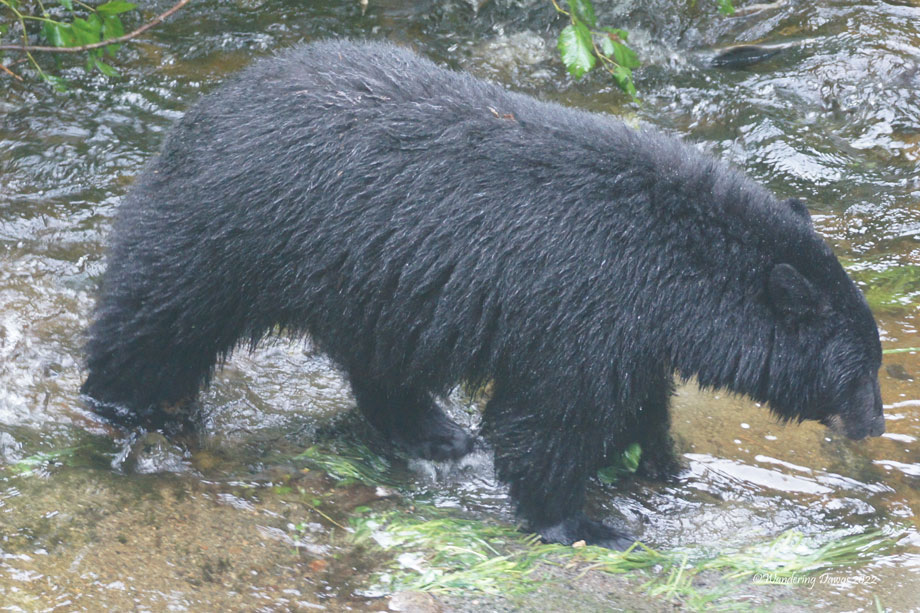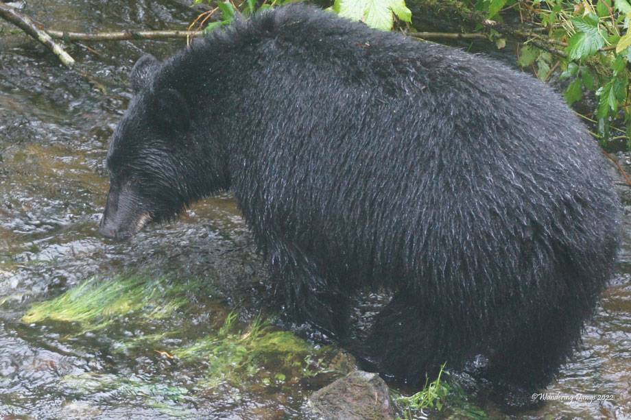 The scenery was spectacular and we found bears! There were eight bears sighted including three cubs. Some of the bears were walking through the dense woods and others were far off at the edge of a field. I saw seven of them but was only able to capture this adult black bear feeding on berries and wading in the creek in search of salmon.