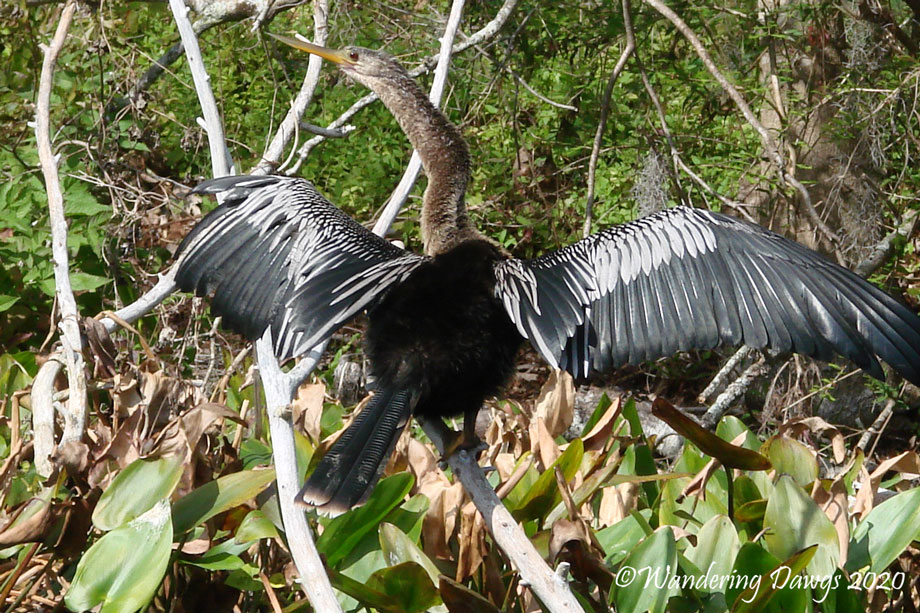 From the Audubon Field Guide: “A long-necked, long-tailed swimmer of southeastern swamps. Often seen perched on a snag above the water, with its wings half-spread to dry. Can vary its buoyancy in water, sometimes swimming with only head and neck above water (earning it the nickname of “Snakebird”). Often solitary when feeding, it roosts in groups and nests in colonies. Looks rather like a cormorant when perched, but not in flight, when the long tail may be spread wide as the Anhinga soars high on outstretched wings. Anhingas are silent at most times, but around nesting colonies they make various croaking and clicking sounds.”