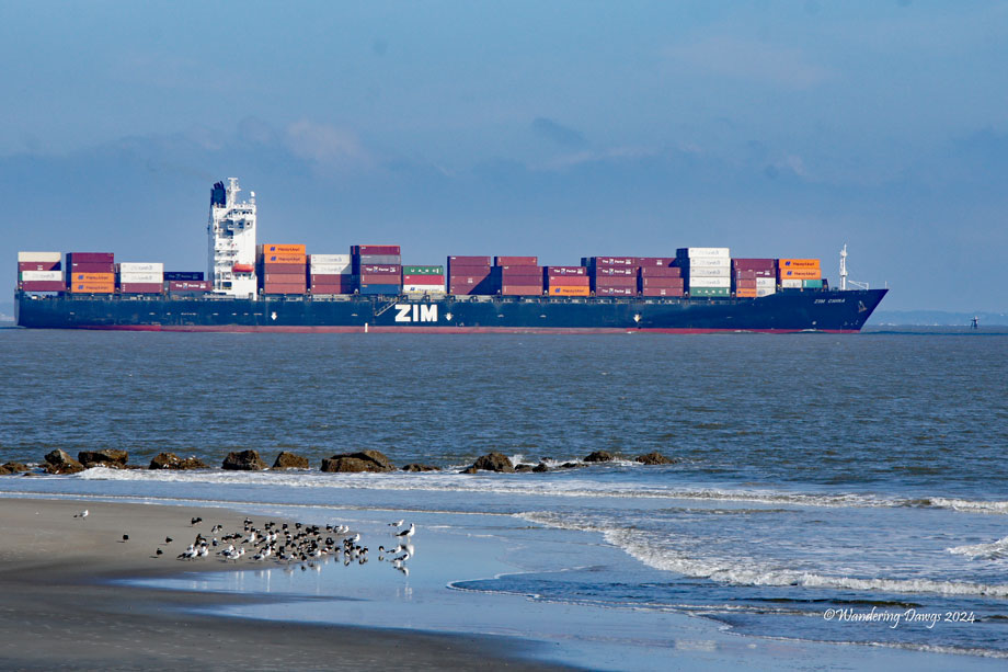 Container ships in the shipping channel are a common sight from the beach. The container ship in the header photo was sailing out to Atlantic Ocean after leaving the port of Savannah.