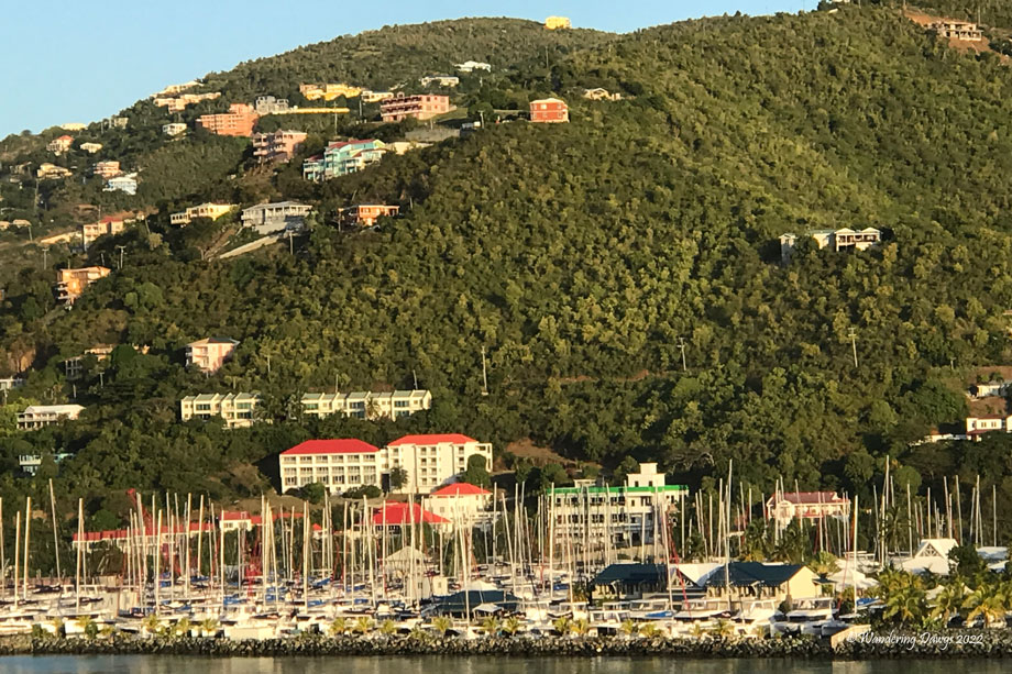 In 2022 we went for a catamaran sail to a beach in the U.S.V.I. National Park. This time we enjoyed watching the activity on the water from our ship before going ashore to wander around the Charlotte Amalie cruise terminal. The header photo shows the bay as seen from our veranda.
